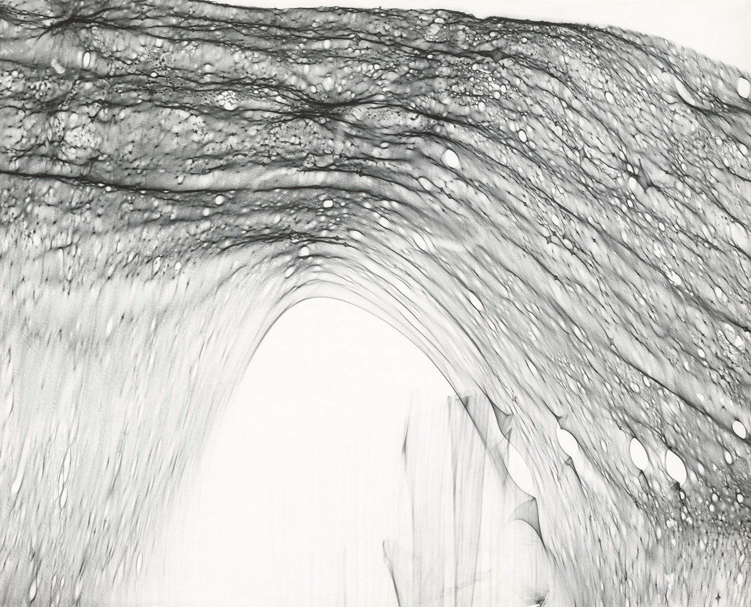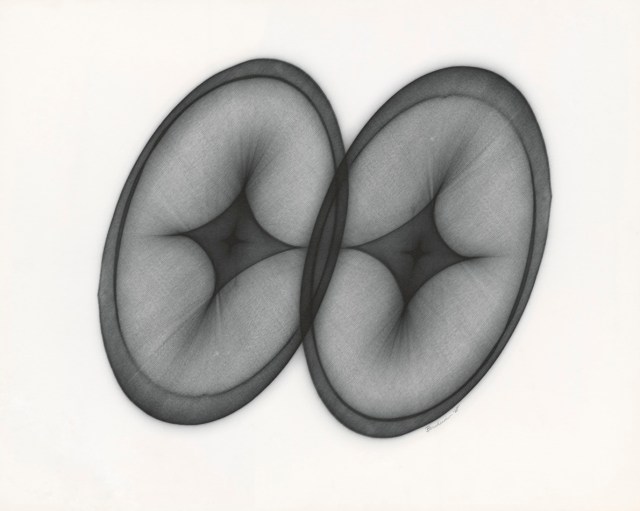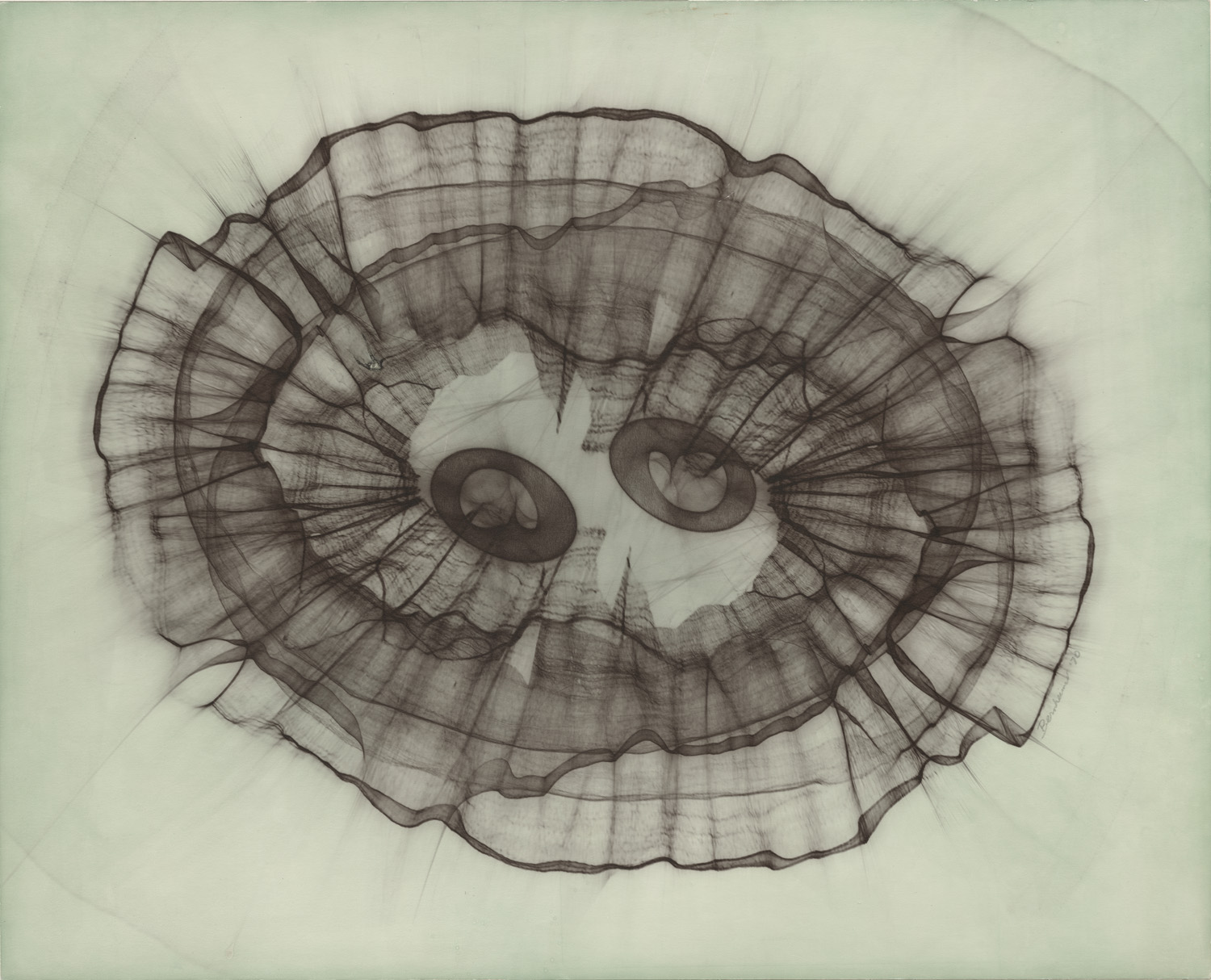 Light is bounced off a polished surface that acts as an imperfect lens, focusing and distorting it to produce intricate shapes and patterns. The texture or fine structure in some REFLECTOGRAPHS is a result of diffraction and interference caused by numerous microscopic scratches in the reflecting surface. Initially using household objects such as glass or metal platters for reflectors, Bernheimer published a book of the images in 1967.